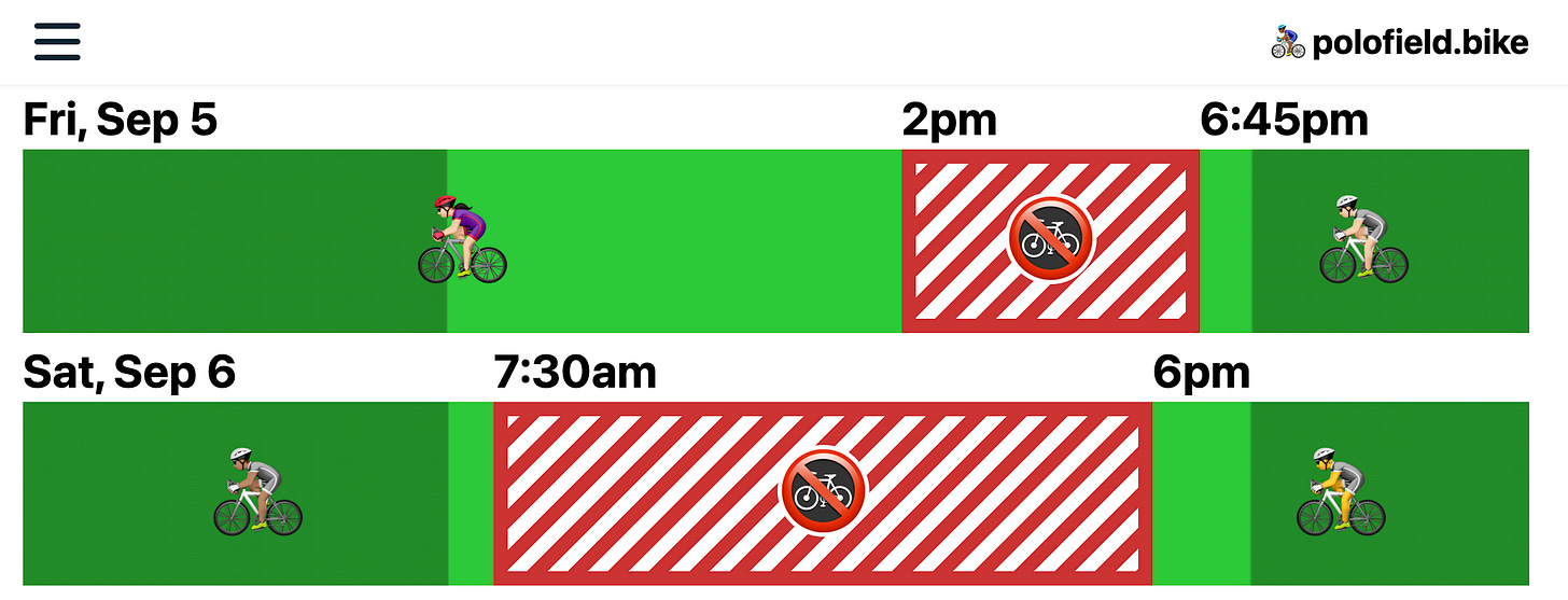 One cyclist got frustrated with the hard-to-use publicly posted schedule of the cycle track, so they just made their own site: polofield.bike – a delightful, emoji based design cleverly incorporating not just closure times, but also helpful details like daylight hours. Just so :chefs-kiss: nerdy and beautiful.